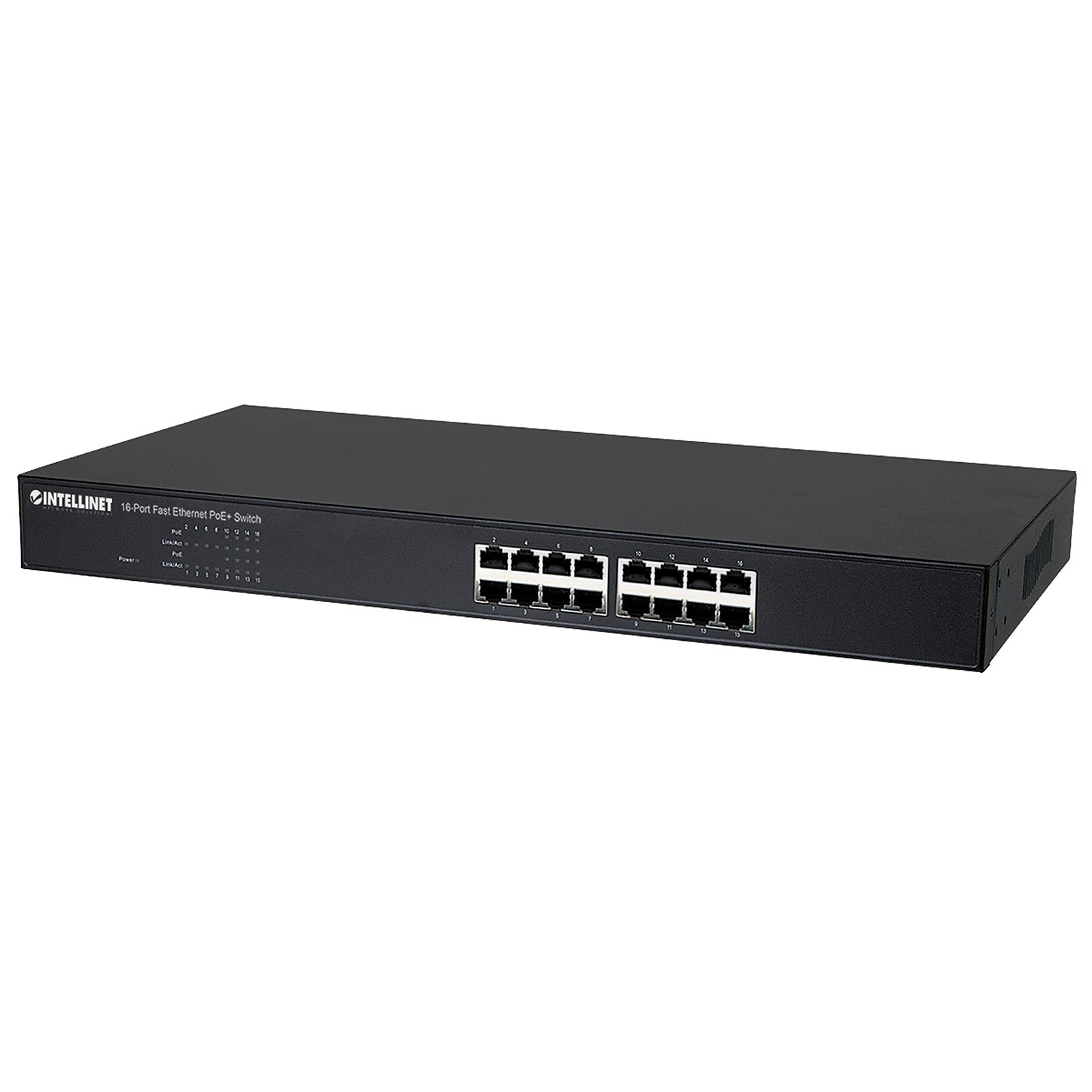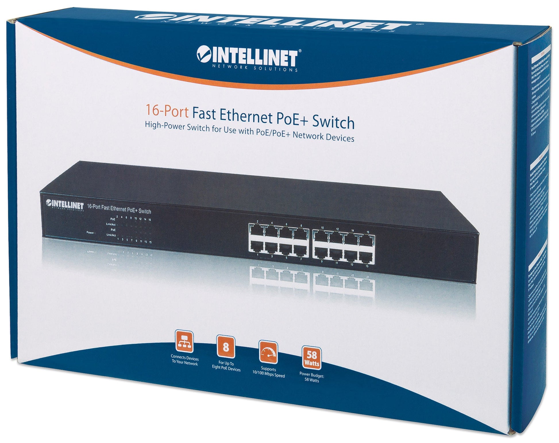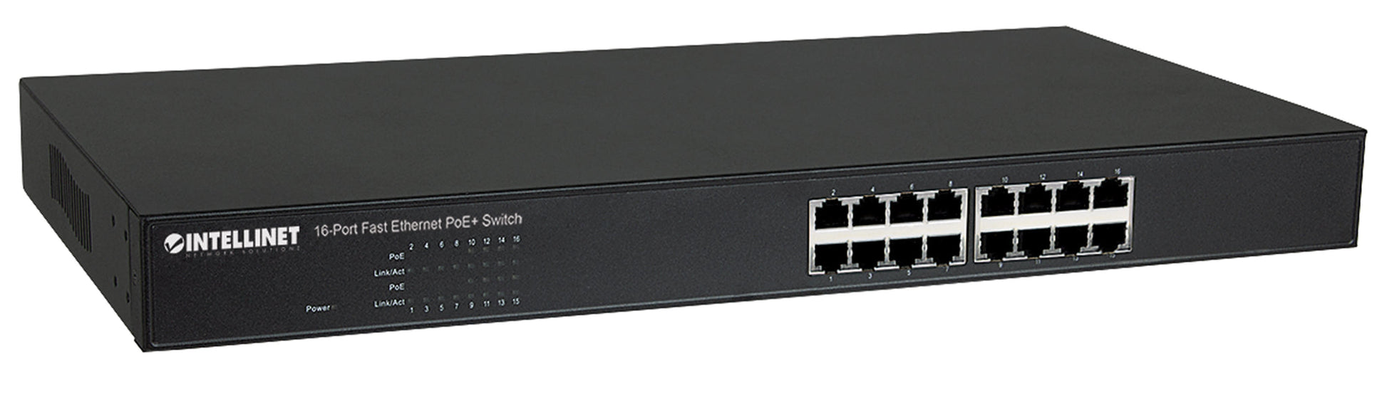 The Intellinet Network Solutions PoE+ Office Switch, Model 560771, is equipped with 16 10/100Base-TX Fast Ethernet ports, eight of which support 802.3af/at Power over Ethernet (PoE/PoE+). Besides being a versatile network LAN switch, it also provides a Power over Ethernet option that supplies power injection to 802.3af/at-compliant devices, such as IP phones, wireless access points and network cameras.